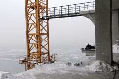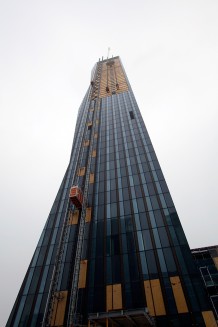 Norbert hat mir dann erzählt, welchen Weg der Kranführer jedes Mal auf sich nehmen muss, um in seine Krankabine zu gelangen. (Über dieses Gerüst kraxeln? Never ever.) Und dass dieser hoffentlich höhenangstfreie Mann nach Fertigstellung des Turms seinen Ruhestand genießen wird. „Ich würde nach so einem Auftrag auch in Pension gehen wollen“, habe ich gelacht.